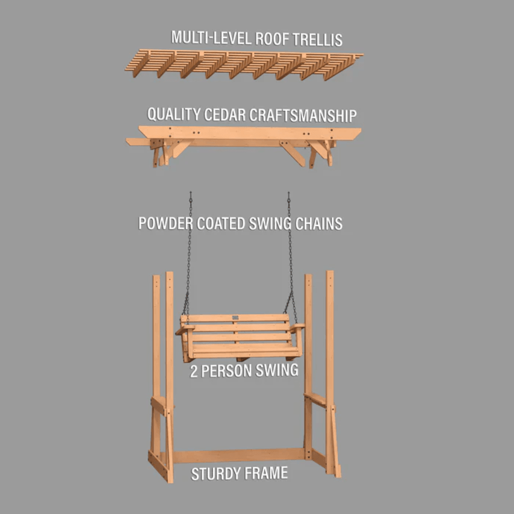 Crafted from 100% durable cedar wood, this classic pergola swing blends timeless aesthetics with superior strength. Featuring pre-cut and pre-drilled lumber for easy assembly, you can enjoy relaxation without the hassle. With a 600 lbs. weight capacity, this two-person swing provides a sturdy and serene way to unwind for years to come.