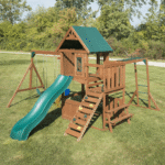 A raised clubhouse offers a cozy retreat for kids to hang out, plan adventures, or simply enjoy a bird’s-eye view of the backyard. The covered canopy provides shade, making it an ideal spot for creative play.