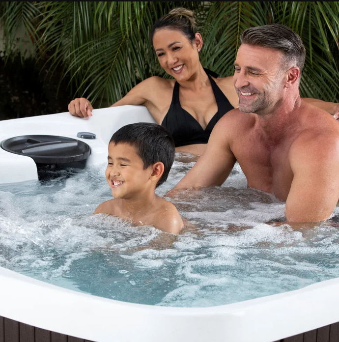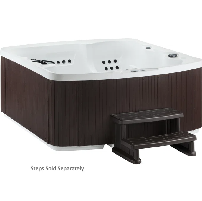The Leganza by Lifesmart Spas is a 230V, 90-jet hot tub designed to bring the ultimate spa experience to your backyard. With comfortable lounge seating and space for up to 6 adults, this premium spa features a relaxing waterfall, multi-color underwater LED lighting, and a durable faux-wood exterior for a stylish, modern look.