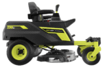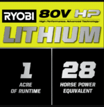Introducing RYOBI’s first lithium-ion battery powered zero turn riding mower, the RYOBI 80V HP Brushless 30″ Lithium Electric ZTR.* HP Technology and 80V batteries combine to deliver the power equivalent of a 28 horsepower gas engine*, while eliminating the hassle and maintenance of a gas mower. This rider cuts up to 1 acre per charge with the help of 4 brushless motors and (2) 80V 10Ah batteries, with a Super Charger that fully recharges in 1.5 hours so you’re ready for your next job. The revolutionary iDrive system uses an intuitive one-handed joystick steering to maneuver around objects more easily than a traditional ZTR. The innovative LCD screen displays runtime, battery life, and more, while the Riding Mower app allows you to monitor charge time and battery life remotely. The 12-point height adjustment allows you to select the perfect cutting height between 1.5″ and 4.5″. This mower continues to lead innovation with the compatible Bagger Boost accessory, which quickly clears the chute with the press of a button. The 30″ deck and rubber side discharge chute allow this rider to fit through a standard 36″ gate, and makes it easy to maneuver around landscaping. Designed with comfort and convenience in mind, this mower features a premium seat, a USB port to charge phones, a storage compartment, and LED headlights. Lawn maintenance will never be the same thanks to the RYOBI 80V HP Brushless 30″ Lithium Electric Zero Turn Riding Mower.