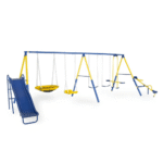 Built with durable, rust-resistant metal, this bright and colorful blue-and-yellow swing set is engineered for safety, stability, and long-lasting use. It’s the perfect backyard playground solution for families looking to encourage active outdoor play while making lifelong memories together.