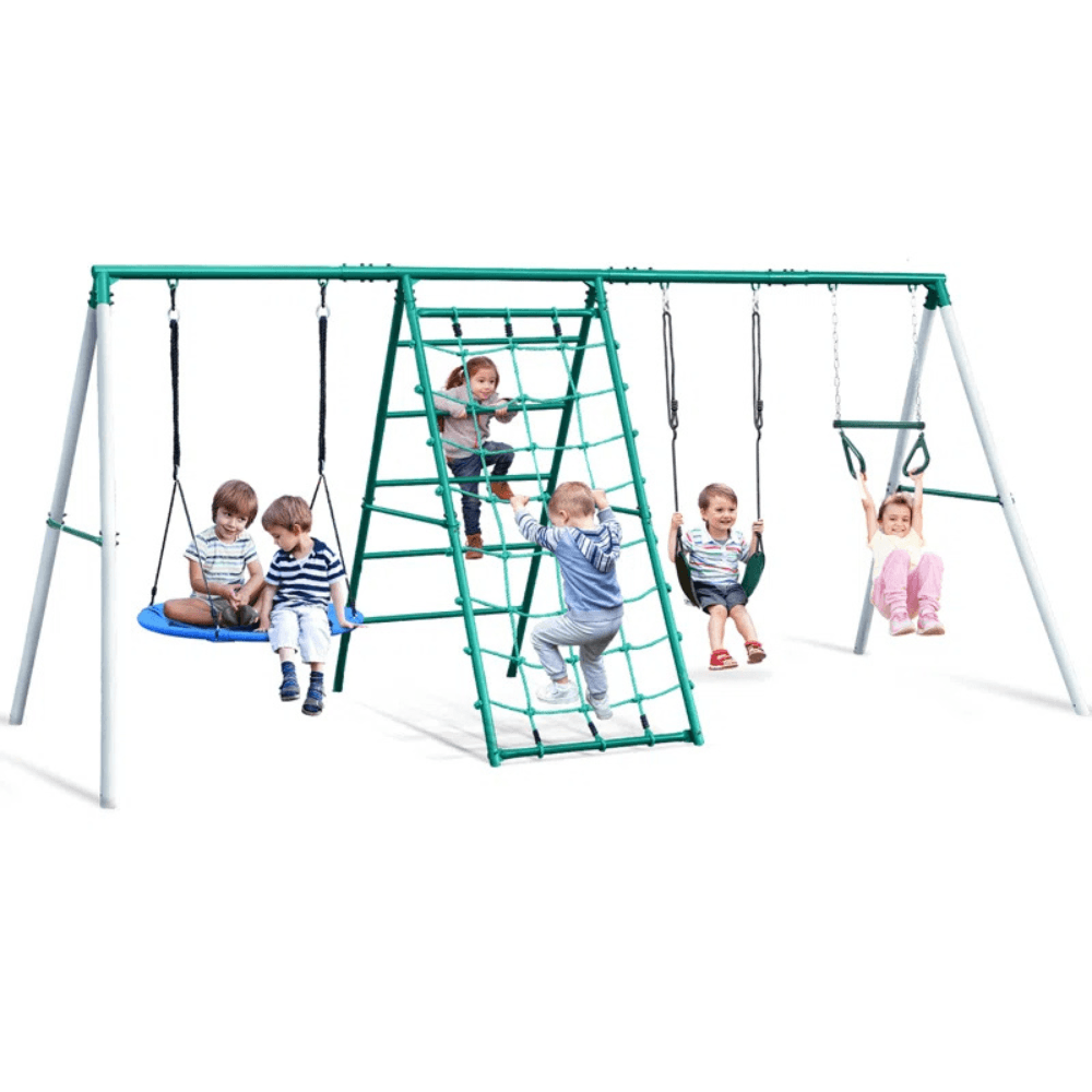 Constructed with a durable steel frame, a stable A-frame design, and powder-coated weather-resistant materials, this swing set is built to withstand years of outdoor play. It’s perfect for medium to large backyards and supports up to seven kids at once, making it an ideal choice for family fun and neighborhood playdates.